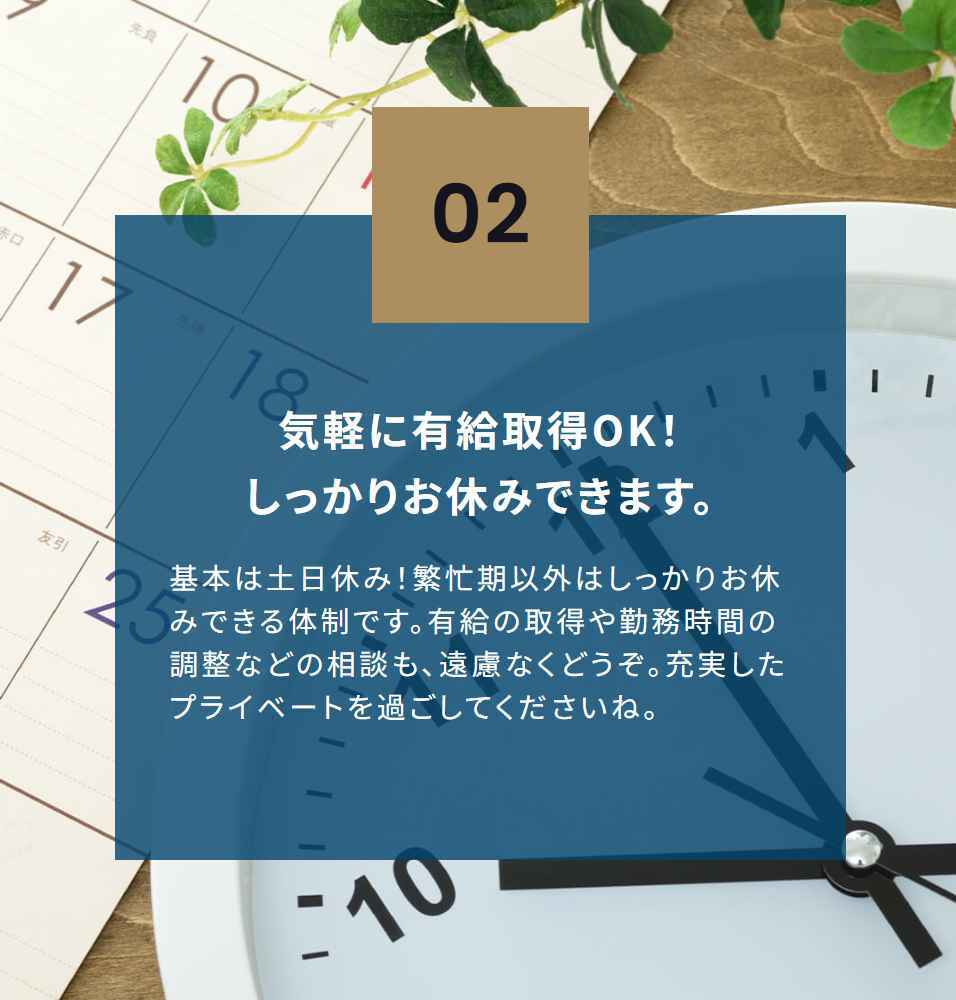 基本は土日休み。繁忙期を除けば、有給休暇も気軽に取得可能。仕事とプライベートのメリハリをつけて、自然豊かな知床ライフを楽しめます。