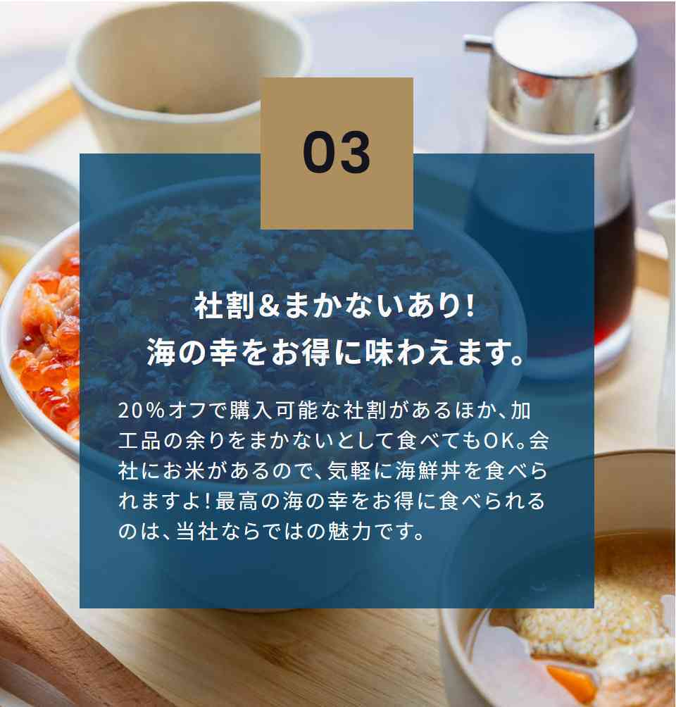 社員割引でお得に海産物を購入できるのはもちろん、加工時に出る余りを使ったまかないで、気軽に絶品の海鮮丼を味わえます。最高の海の幸を、働きながら楽しめるのは当社ならではの魅力です。