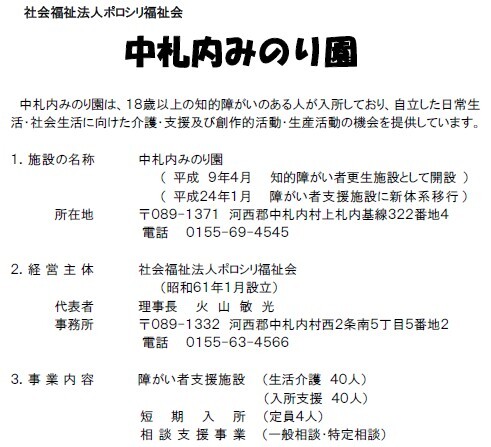| 勤務地 | 社会福祉法人ポロシリ福祉会 障がい者支援施設中札内みのり園 北海道河西郡中札内村上札内基線322番地4 |