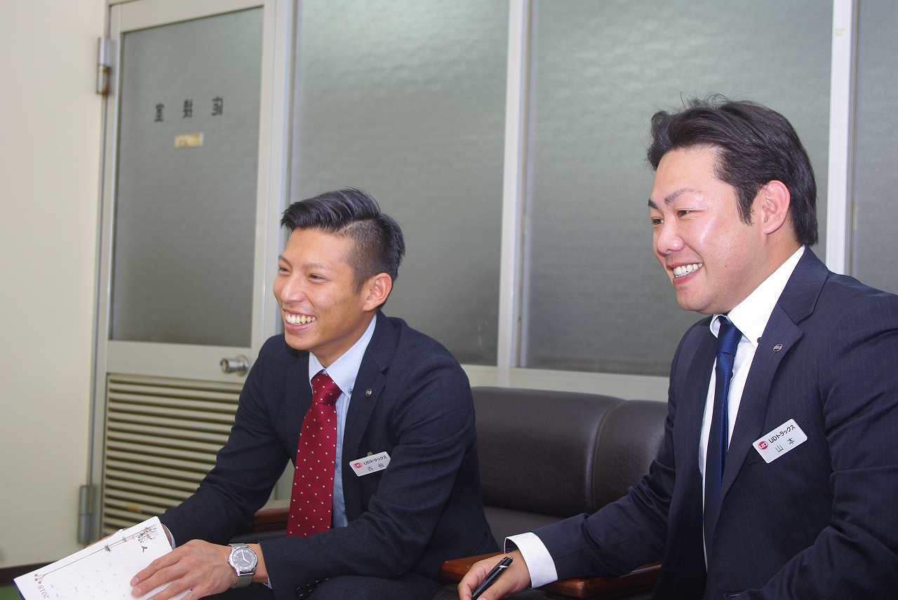 UDトラックスの顔となってお客様である企業を訪問し、iPadやパンフレットを基に新車・中古車の購入のご提案や車輌の点検、整備のご案内をします。お客様のニーズに合わせた車輌を提案し最善のものが出来上がるまで何度も打ち合わせを重ねて、信頼関係も共に築き上げていきます。売るだけではなく、その後のアフターフォローも行い、一台のトラックを通してお客様と長いお付き合いになります。