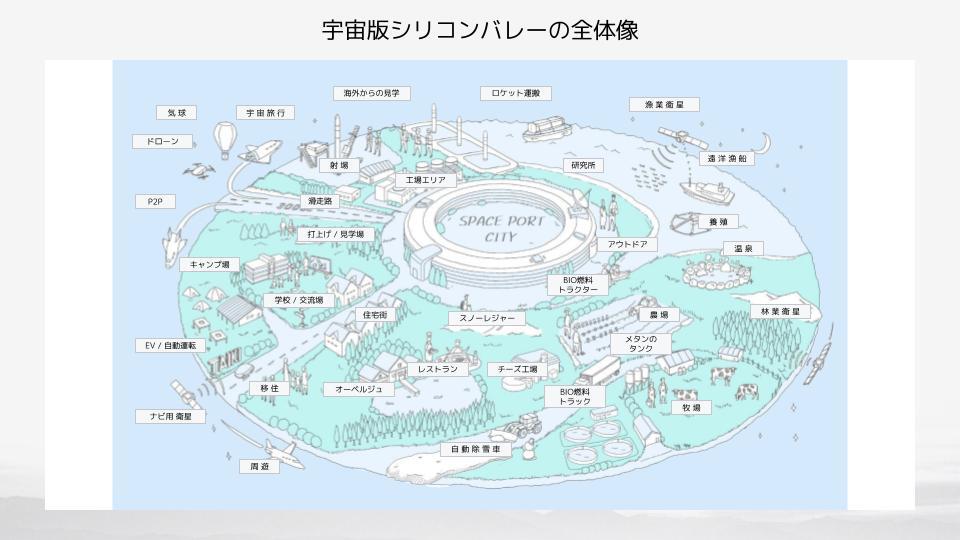 また、私たちは宇宙港の周辺に航空宇宙関連企業の集積と、宇宙×〇〇の様々なビジネスを創出する「宇宙版シリコンバレー」の実現をビジョンとして掲げ、自治体と連携して宇宙のまちづくりも進めています。