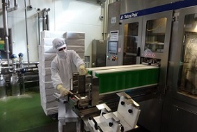 充填作業。パック牛乳の充填機に紙パックを装填します。